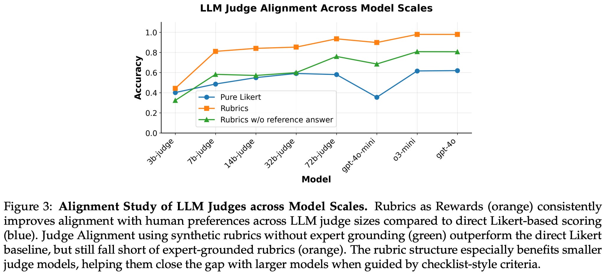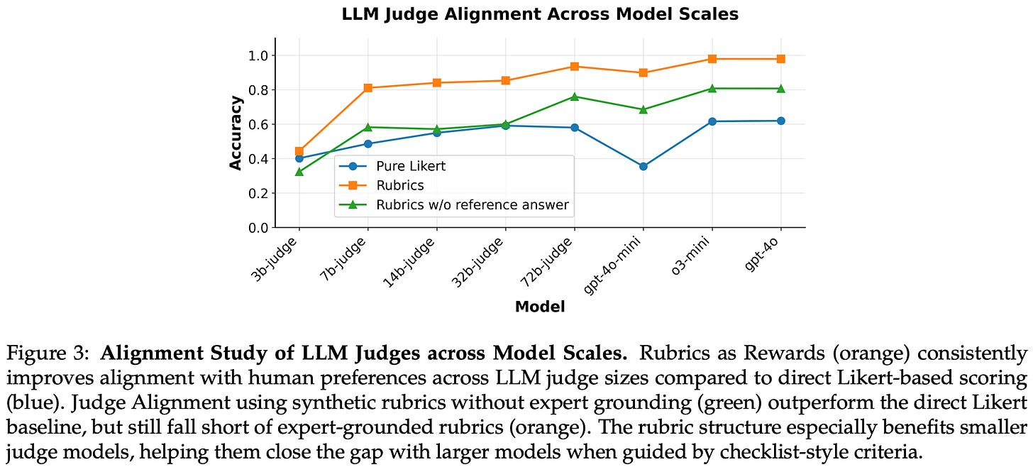 These experiments also highlight the necessity of expert-curated references for generating rubrics—performance noticeably deteriorates without references, indicating purely synthetic rubrics are suboptimal. Predefined or generic rubrics are also found to perform quite poorly, indicating that prompt-specific criteria are useful for deriving high-quality rubrics. These best practices for creating better rubrics are also evaluated beyond their impact on RL training. In [1], authors show that rubrics created via their proposed approach have noticeably higher levels of agreement with preference annotations from human experts; see below.