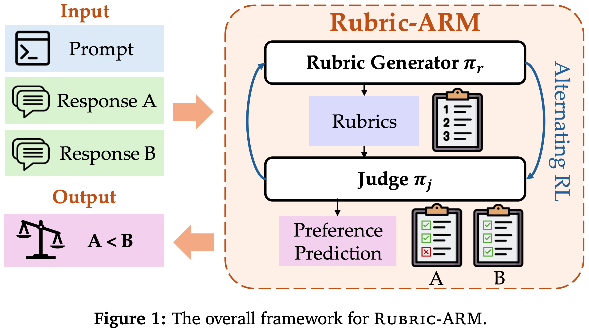 Rubric-ARM. There are two models being trained in this framework: a rubric generator and an LLM judge. These models are trained with an alternating RL framework that switches between training each model. This approach, called Rubric-ARM, jointly optimizes the generator’s ability to create a rubric and the judge’s ability to predict human-aligned preference scores given a rubric as input. By learning these components together (i.e., instead of using separate training pipelines), we allow them to co-evolve and reinforce each other throughout training.