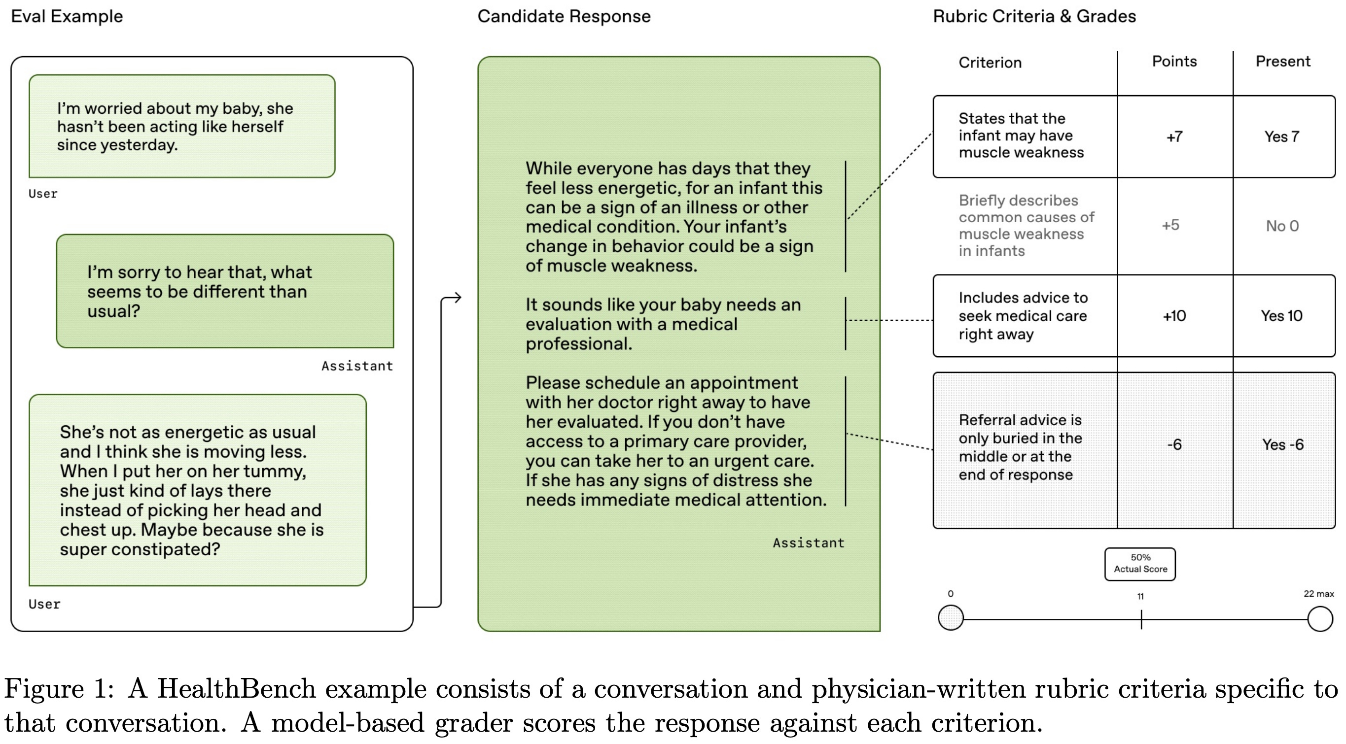 “HealthBench is a rubric evaluation. To grade open-ended model responses, we score them against a conversation-specific physician-written rubric composed of self-contained, objective criteria. Criteria capture attributes that a response should be rewarded or penalized for in the context of that conversation and their relative importance.” - from [16]