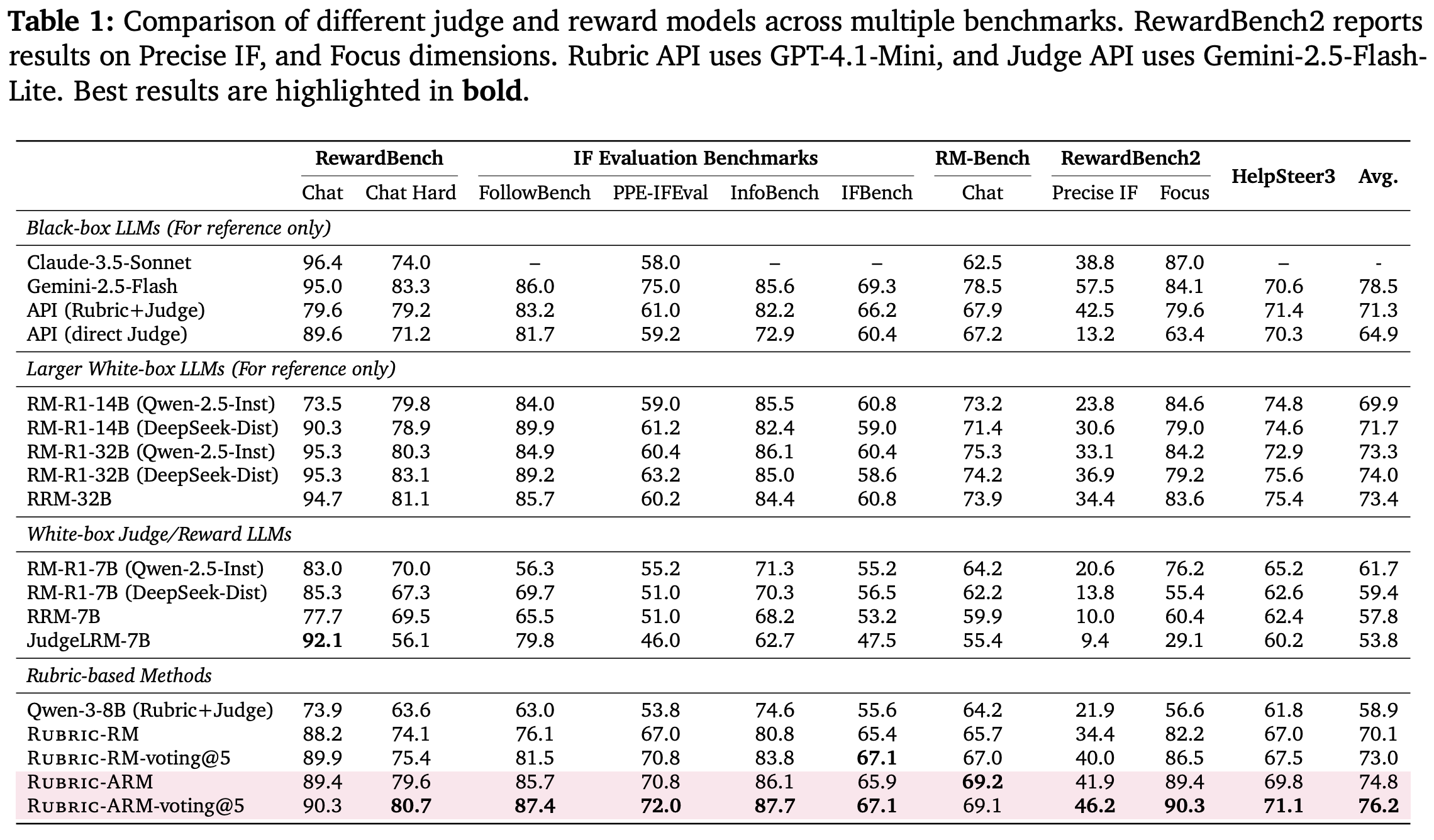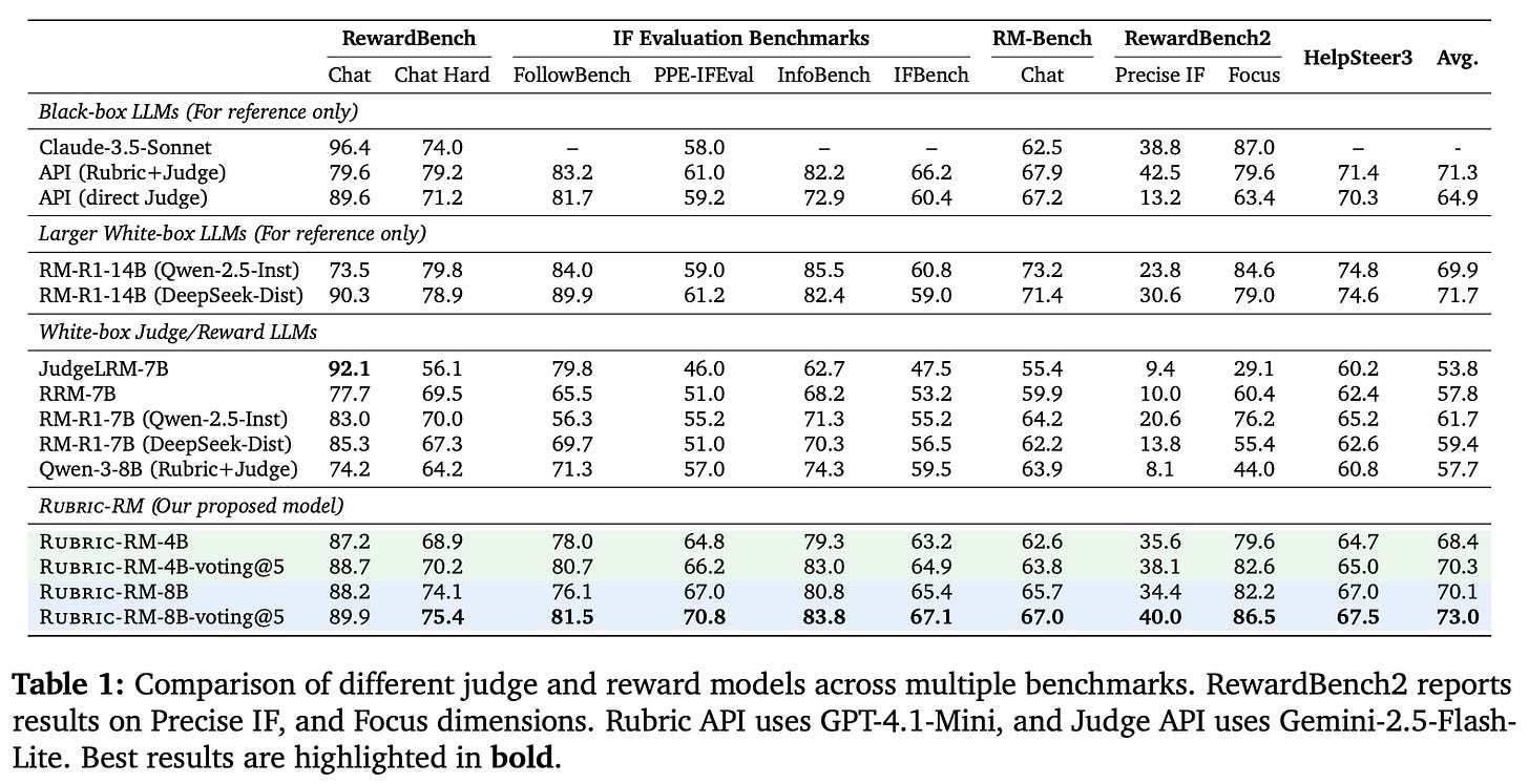 “Rubric-ARM outperforms strong reasoning-based judges and prior rubric-based reward models, achieving a +4.7% average gain on reward-modeling benchmarks, and consistently improves downstream policy post-training when used as the reward signal.” - from [5]