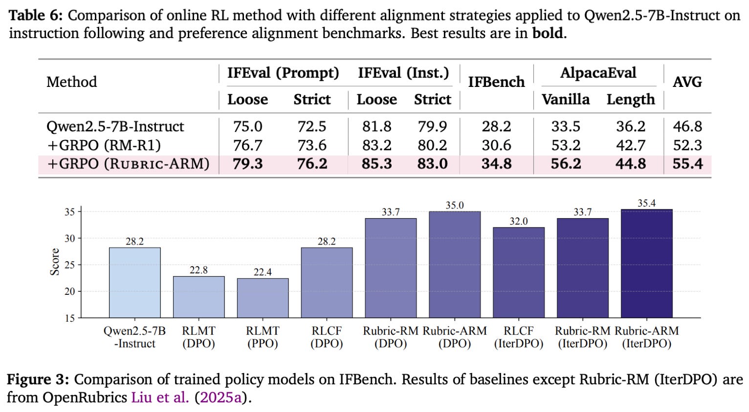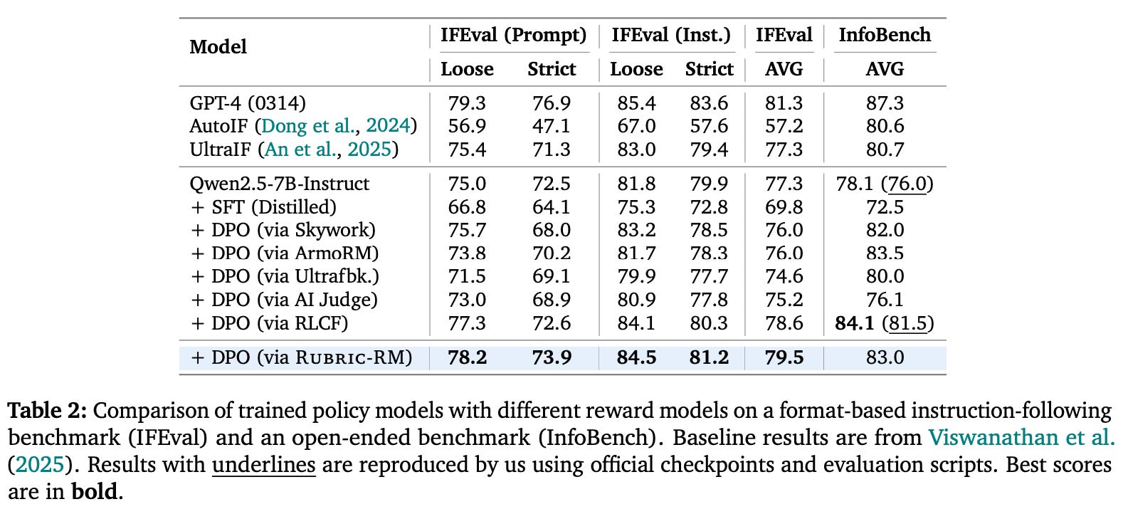 Application to post-training. Beyond evaluating Rubric-RM on reward modeling benchmarks, we can also measure the model’s downstream impact by using it as a reward signal in LLM post-training. Downstream evaluations in [3] only consider instruction following tasks (i.e., IFEval, InfoBench, and IFBench)—likely because this is the domain on which Rubric-RM excels—and use DPO for preference tuning. Rubric-RM is found to yield a boost over other reward models; see below.