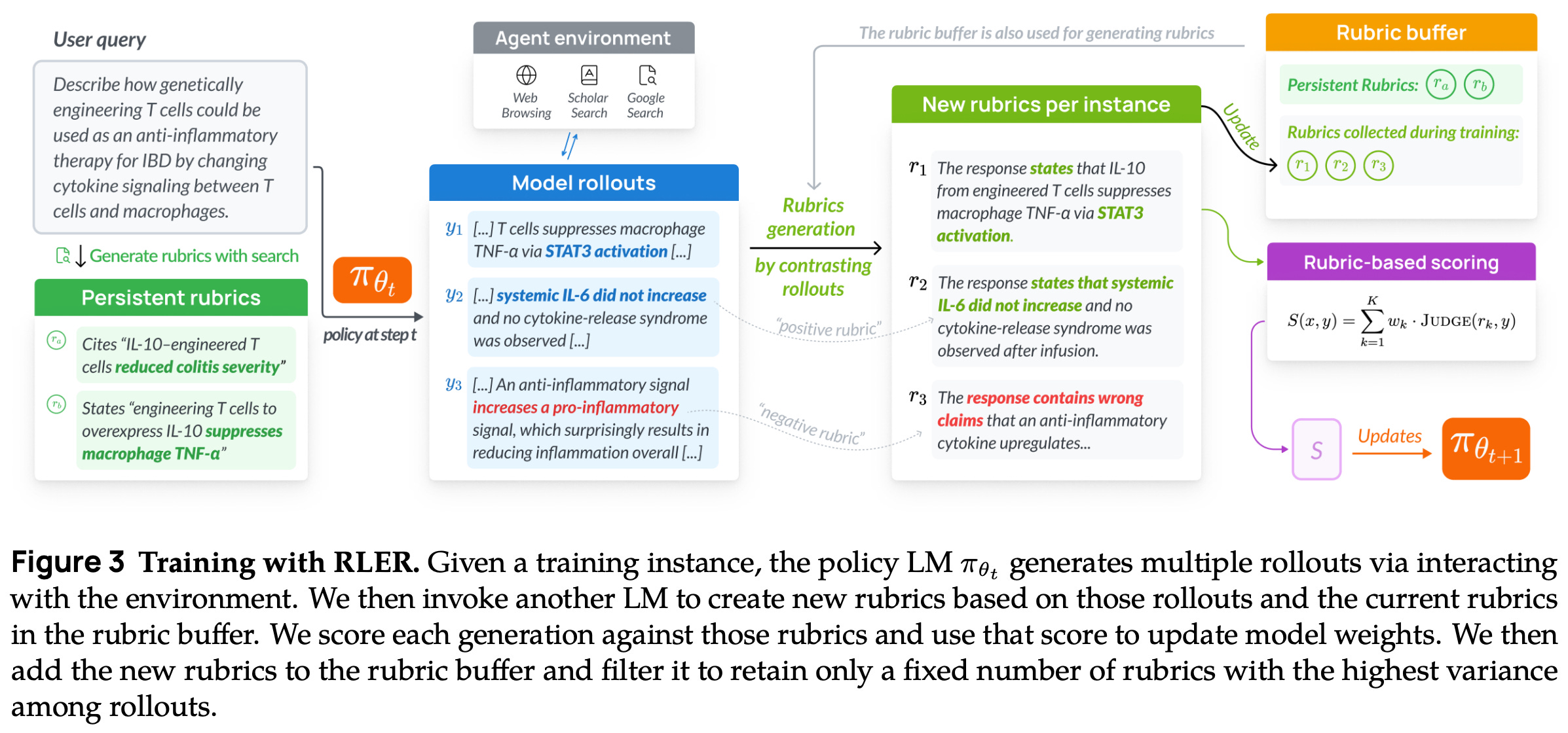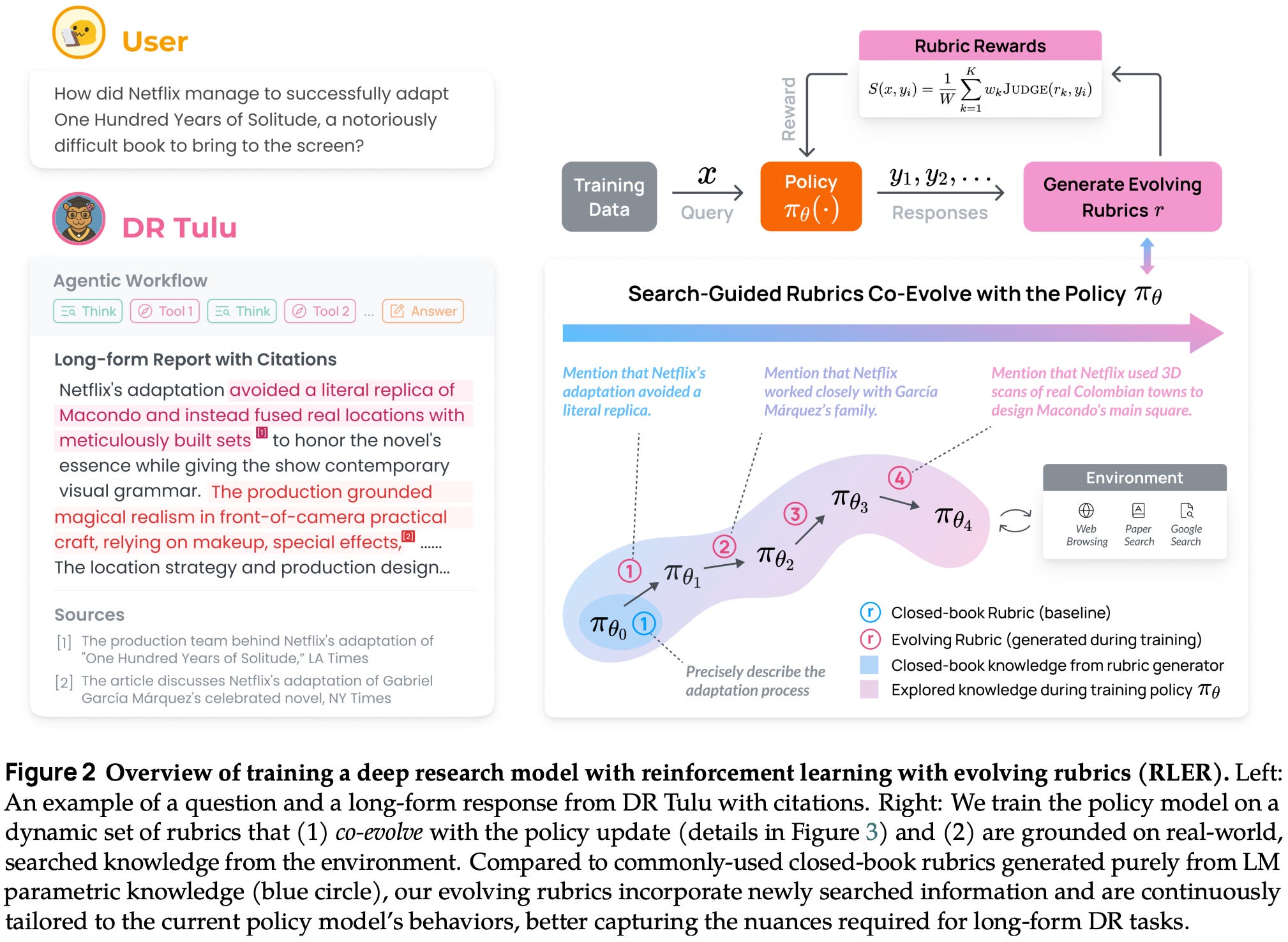 Evolving rubrics. To address the unique considerations of DR tasks, Dr. Tulu is trained using a modified rubric-based RL technique, called Reinforcement Learning with Evolving Rubrics (RLER), that derives a reward from instance-specific rubrics that i) evolve alongside the policy during training and ii) are grounded in knowledge from the internet; see above. Similarly to prior work, rubrics are defined as a set of weighted criteria. Each of these criteria can be scored with a separate LLM judge to derive a final score as shown below. This formulation matches the explicit aggregation strategy proposed in [1].