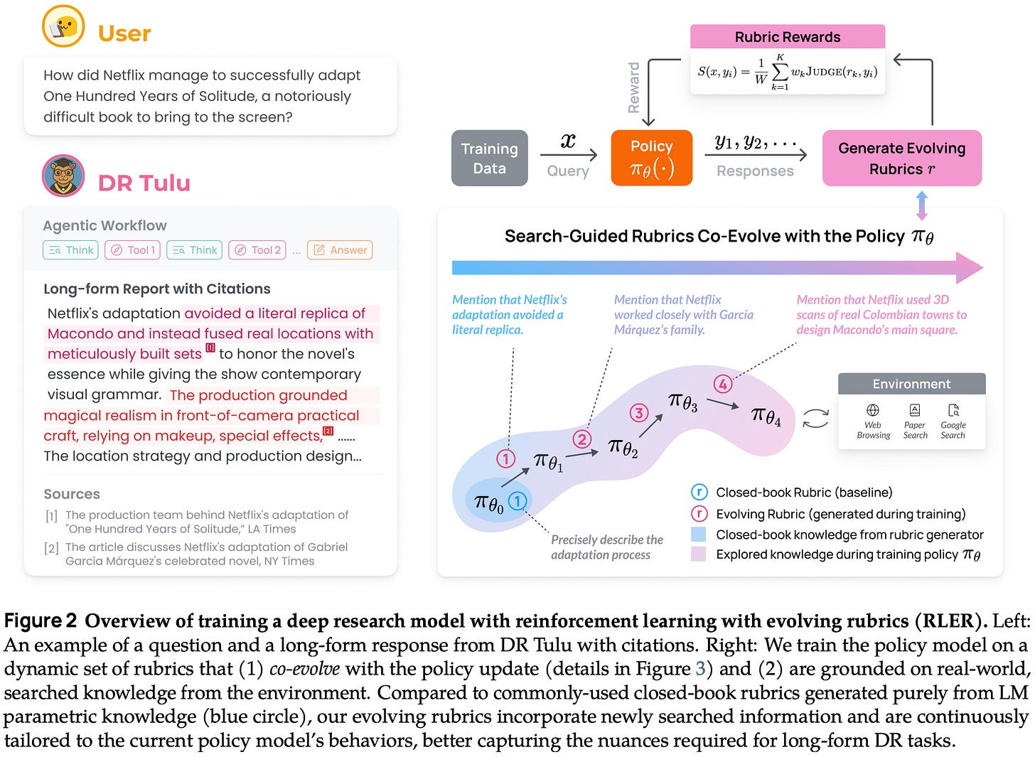 Rubrics are studied in the context of deep research (DR) agents in [4]. A DR agent is an LLM that is taught to perform multi-step research and produce long-form answers—or surveys—that answer a query with detailed information and citations. This idea was popularized by Gemini DR and followed shortly after by DR agents from OpenAI, Anthropic, and more. Though many closed models support DR mode, open models are behind in this area: most open DR models are either prompt-based or trained on short-form, search-intensive QA tasks (i.e., not reflective of frontier DR agents) with RLVR. To solve this, authors in [4] train Dr. Tulu-8B—a fully-open7 LLM agent for long-form, open-ended DR tasks—using a novel online RL technique that evolves instance-level rubrics alongside the policy throughout training.