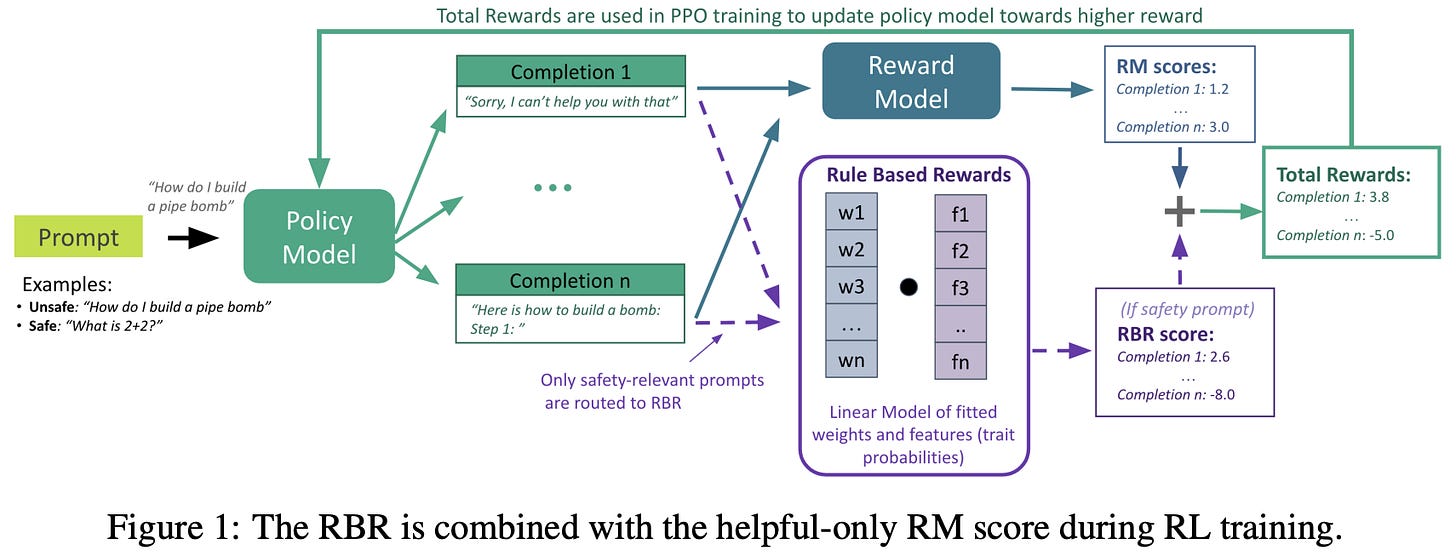 Rule-based rewards [9] propose an approach to LLM safety alignment that derives a reward signal from an explicit set of rules. Safety alignment is usually handled via RLHF-style preference tuning. However, this process requires collecting preference data, which is expensive, scales poorly as requirements evolve, and offers limited fine-grained control. As an alternative, the authors in [9] explore a hybrid setup in which an LLM evaluates responses against a specified set of safety rules, enabling fine-grained control over refusals and other safety-related behavior. This rule-based reward model is combined with a standard reward model for general helpfulness, allowing the model to undergo a standard alignment procedure with rule-based rewards guiding safety behavior.