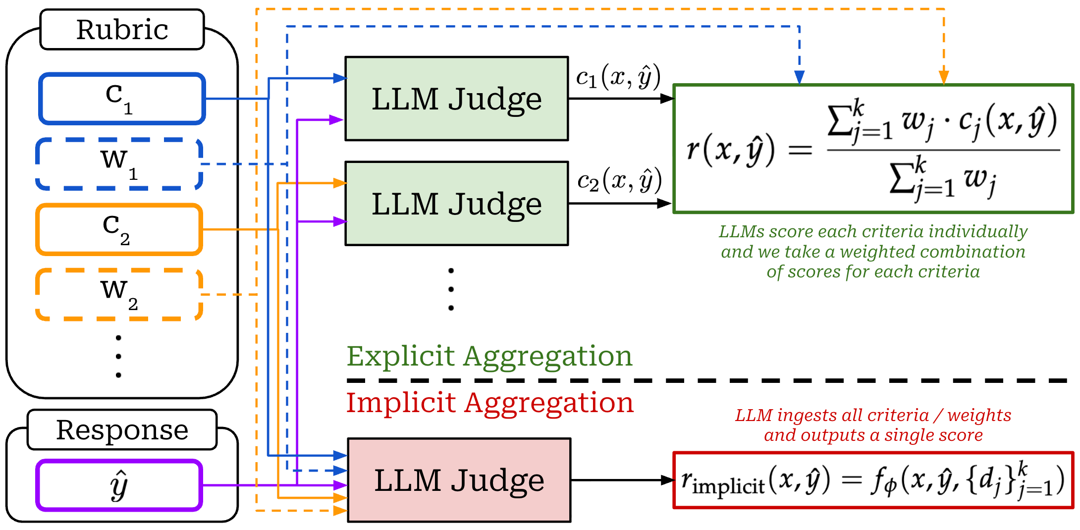 Implicit aggregation: all criteria along with their weights are passed to an LLM judge, which is asked to derive a final reward that considers all information.