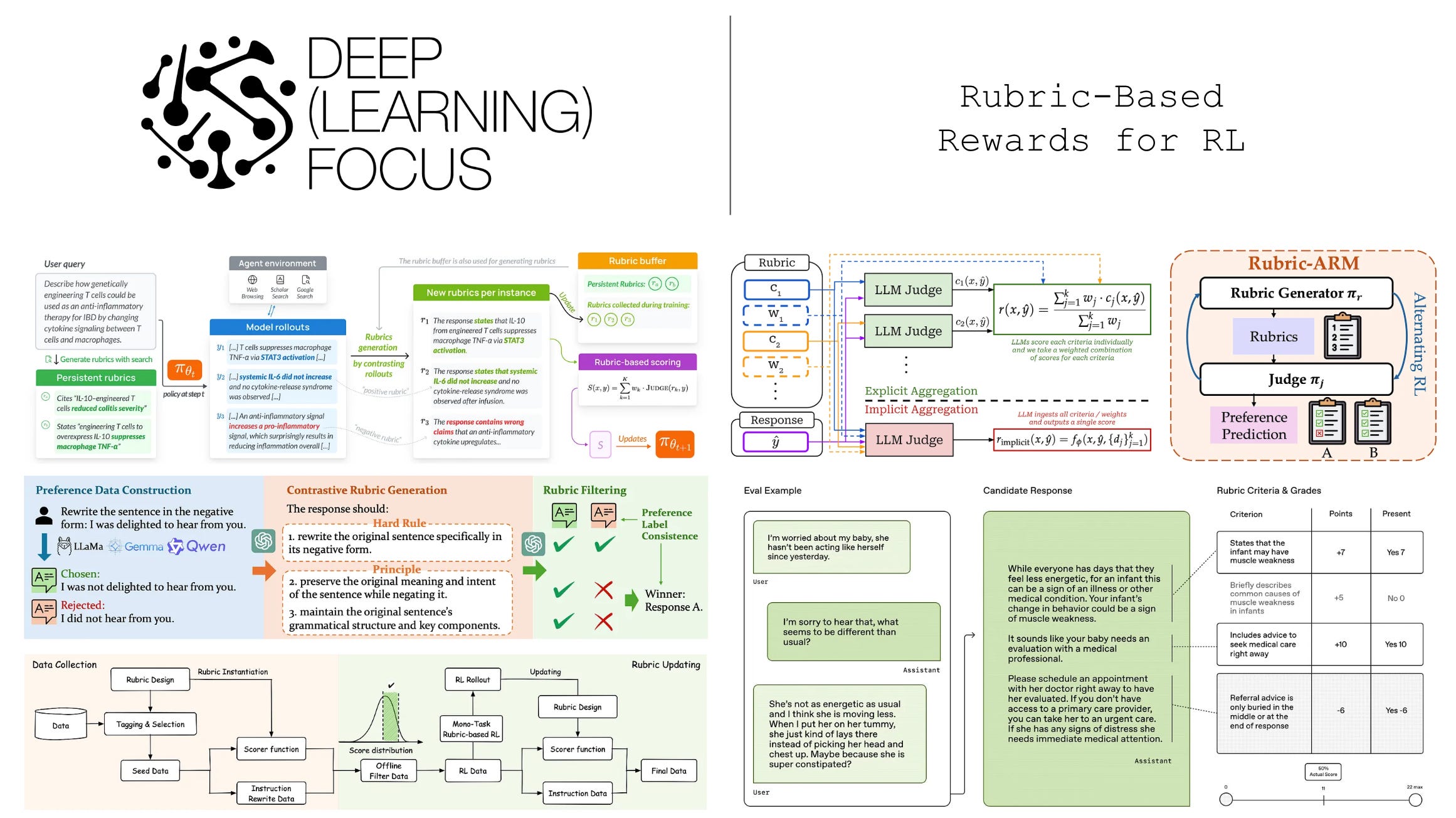 “Rubric-ARM [is] a framework that jointly optimizes a rubric generator and a judge using RL from preference feedback. Unlike existing methods that rely on static rubrics or disjoint training pipelines, our approach treats rubric generation as a latent action learned to maximize judgment accuracy. We introduce an alternating optimization strategy to mitigate the non-stationarity of simultaneous updates.” - from [5]
