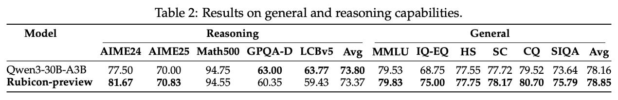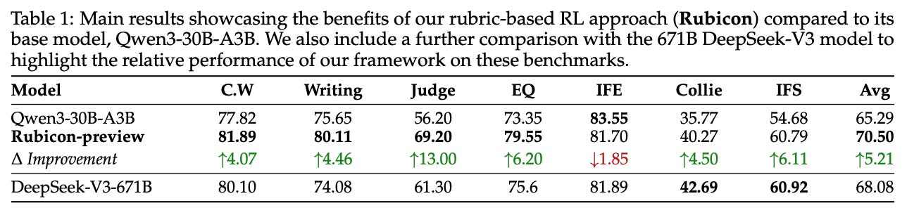 Rubicon-preview is a Qwen-3-30B-A3B base model that is finetuned in [2] using the Rubicon framework. This model excels in open-ended and humanities-related benchmarks. For example, we see below that Rubicon-preview achieves an absolute improvement of 5.2% compared to the base model on various instruction following, emotional intelligence, and writing benchmarks. Notably, Rubicon-preview also outperforms DeepSeek-V3-671B on most of these tasks, where an especially significant performance boost is observed on writing tasks.