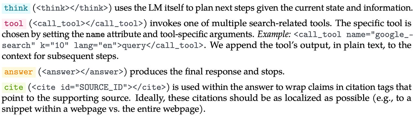 Authors in [4] use these observations to formalize an action space for DR agents; see below. In this formulation, a DR agent has the ability to i) think, ii) call a set of search tools, iii) provide a final answer, and iv) insert citations into the final answer. For all actions, any context that is output (e.g., thinking traces or tool outputs) is just concatenated to the sequence being processed by the DR agent. The DR agent itself is just an LLM that performs tool use in this action space.