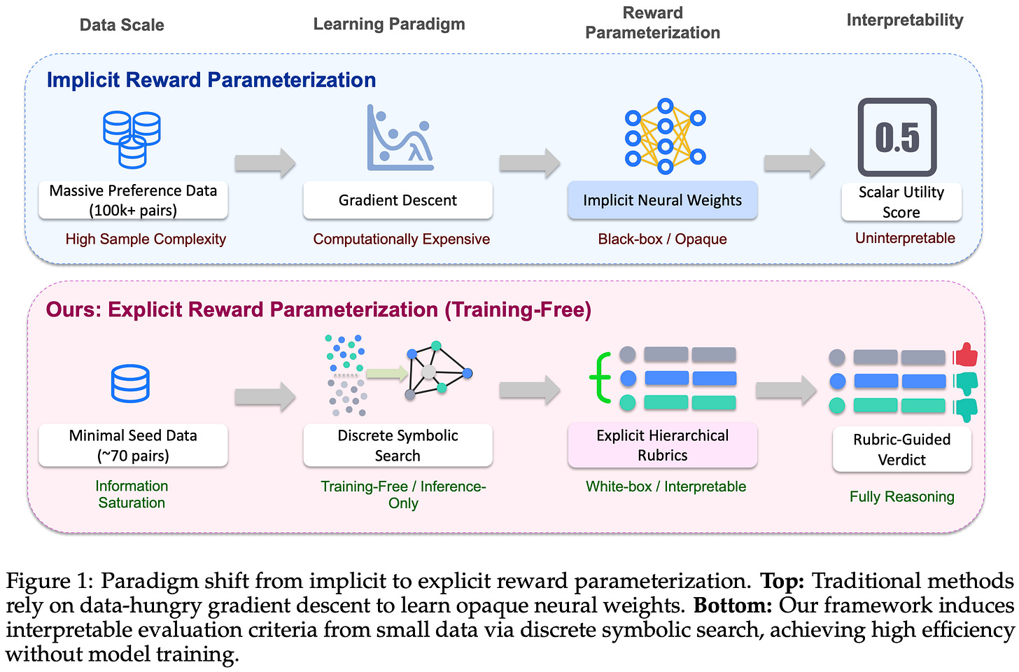 RLHF is a general technique, but it is usually used in practice for improving broad, subjective properties; e.g., helpfulness, harmlessness, or style. For complex, open-ended tasks, the reward signal tends to be multi-dimensional. Traditional reward modeling captures these quality dimensions via a single preference label, which eliminates our ability to specify quality dimensions at a more granular level. One could collect criterion-level preferences to solve this issue, but doing so requires training (and maintaining) separate reward models per criterion and increases the volume of data that must be collected. A natural alternative is to make evaluation dimensions explicit by using a rubric to ground the reward in structured, interpretable criteria rather than a single judgment.