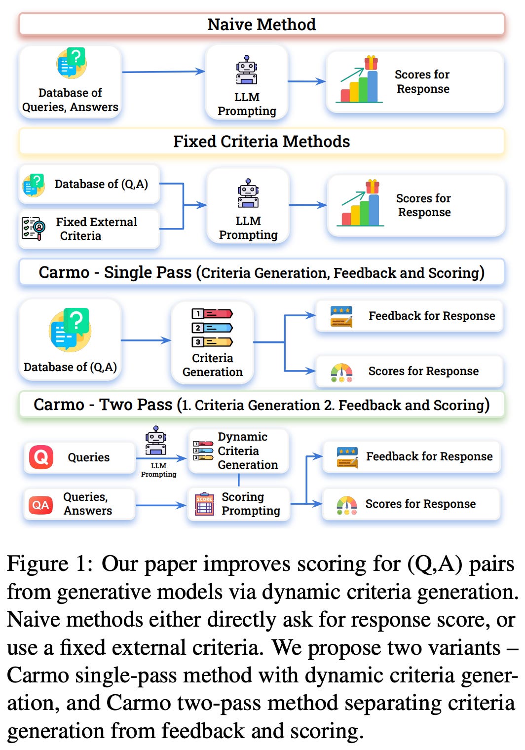 Context-Aware Reward Modeling (CARMO) [10] attempts to mitigate problems with reward hacking in human preference alignment with RLHF. Going beyond static evaluation rubrics, an LLM first dynamically generates evaluation criteria for each prompt. Then, these criteria are used by the LLM to score the response, and the score can be directly used as a reward signal for preference alignment.