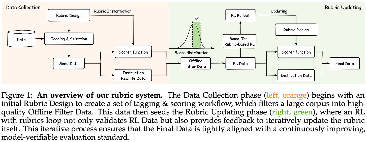 Rubric system. Instead of using strictly instance-level rubrics, multiple scopes are considered in [2], including instance, task, and dataset-level rubrics. When generating data, the system in [2] (shown below) starts by constructing the rubric first. Data is synthesized only after the rubric is created so that it explicitly matches the rubric. Then, the combination of rubric and data is used for both RL training and evaluation. Tasks in [2] are selected according to the asymmetry of verification—verifying a candidate output should be much easier than generating it.