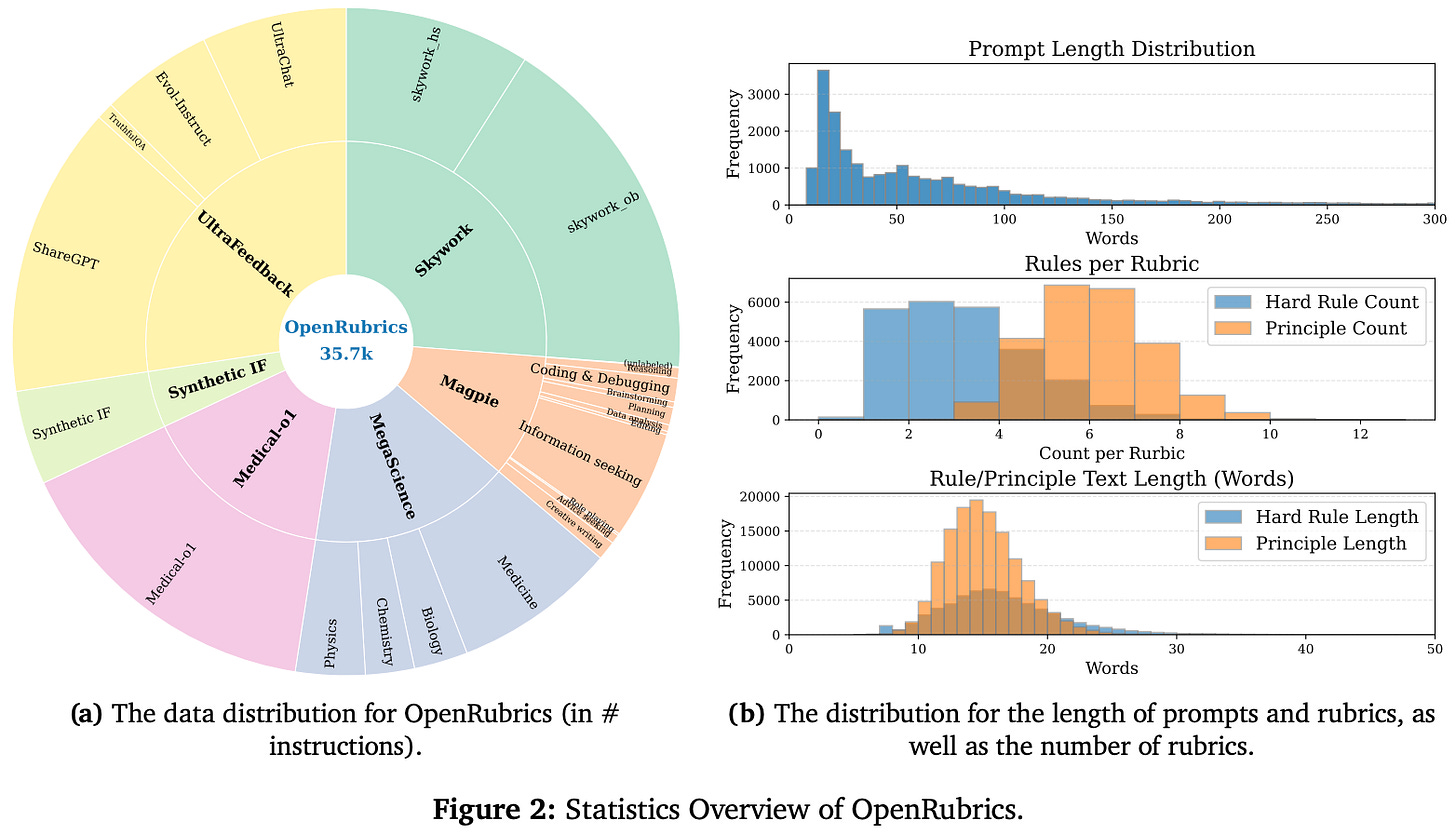 Experimental settings. In [1], authors see rubrics as an opportunity to provide flexible, scalable, and interpretable reward signals for RL in real-world domains that go beyond verifiable problems like code and math. Moving in this direction, two non-verifiable domains are considered in [1]: medicine and science. Prompts and rubrics used for RL in [1] are sampled from a mixture of public datasets, such as NaturalReasoning, SCP-116K, and GeneralThought-430K. This data is further curated to create two datasets for RaR training in [1]: