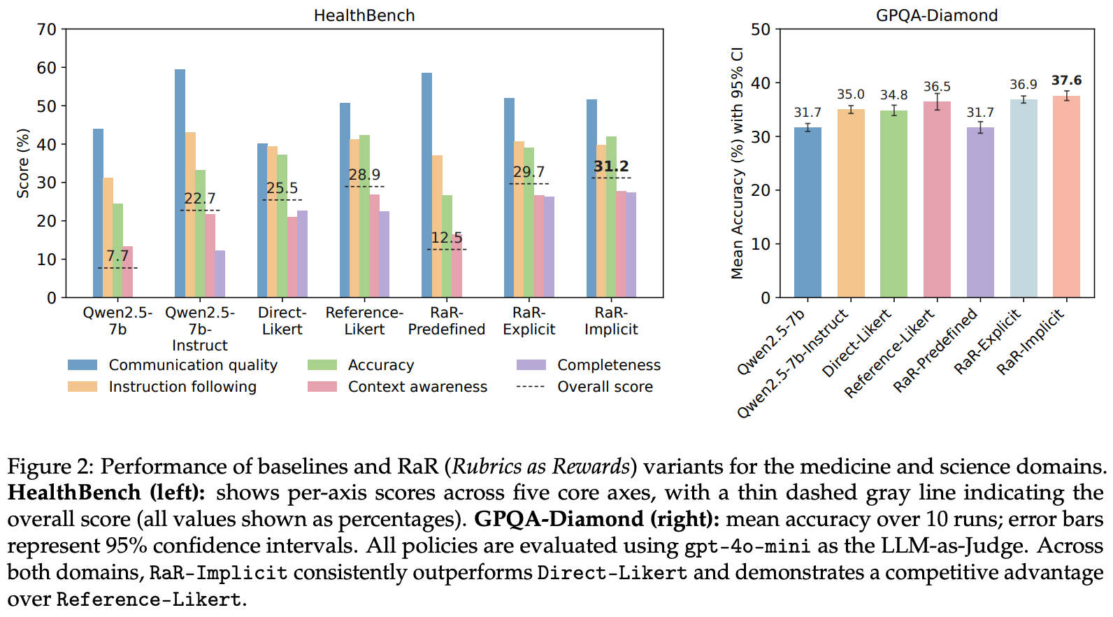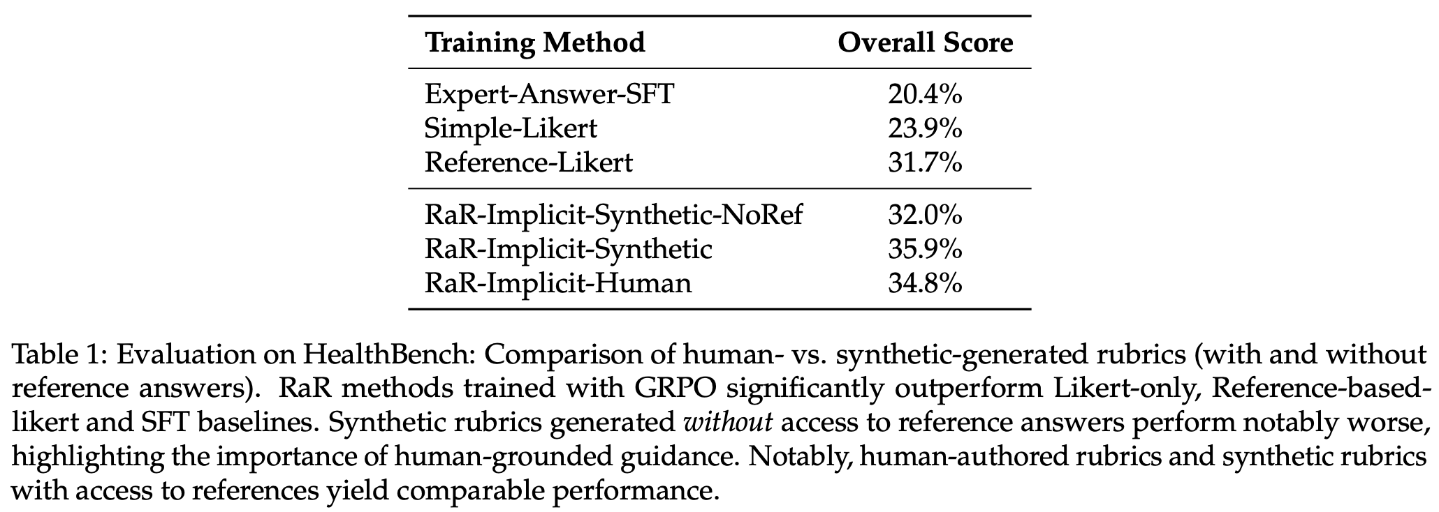 Do rubrics provide useful rewards? Across all experiments in [1], we see that using structured, rubric-based rewards during RL training is beneficial. Rubric-based rewards are especially impactful when using smaller LLM judges for RL training and are found to reduce variance in reward signals across different sizes of LLM judges. As shown above, rubric-based approaches outperform all rubric-free methods aside from the reference-based LLM judge, relative to which we only see marginal gains from rubrics. However, rubrics are found to yield a more notable gain over reference-based LLM judge rewards in later experiments that train on HealthBench; see below. We also see that implicit aggregation tends to outperform explicit aggregation by a small (but consistent) margin.