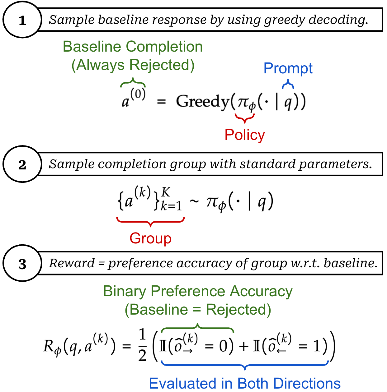 Once we have these completions, we use them to derive a direct assessment reward from the pairwise comparisons predicted by the LLM judge. To do this, Rubric-ARM creates preference pairs between each rollout in the group and the baseline completion. Then, our reward is defined as whether Rubric-ARM correctly predicts the greedy baseline as the rejected completion; see below.