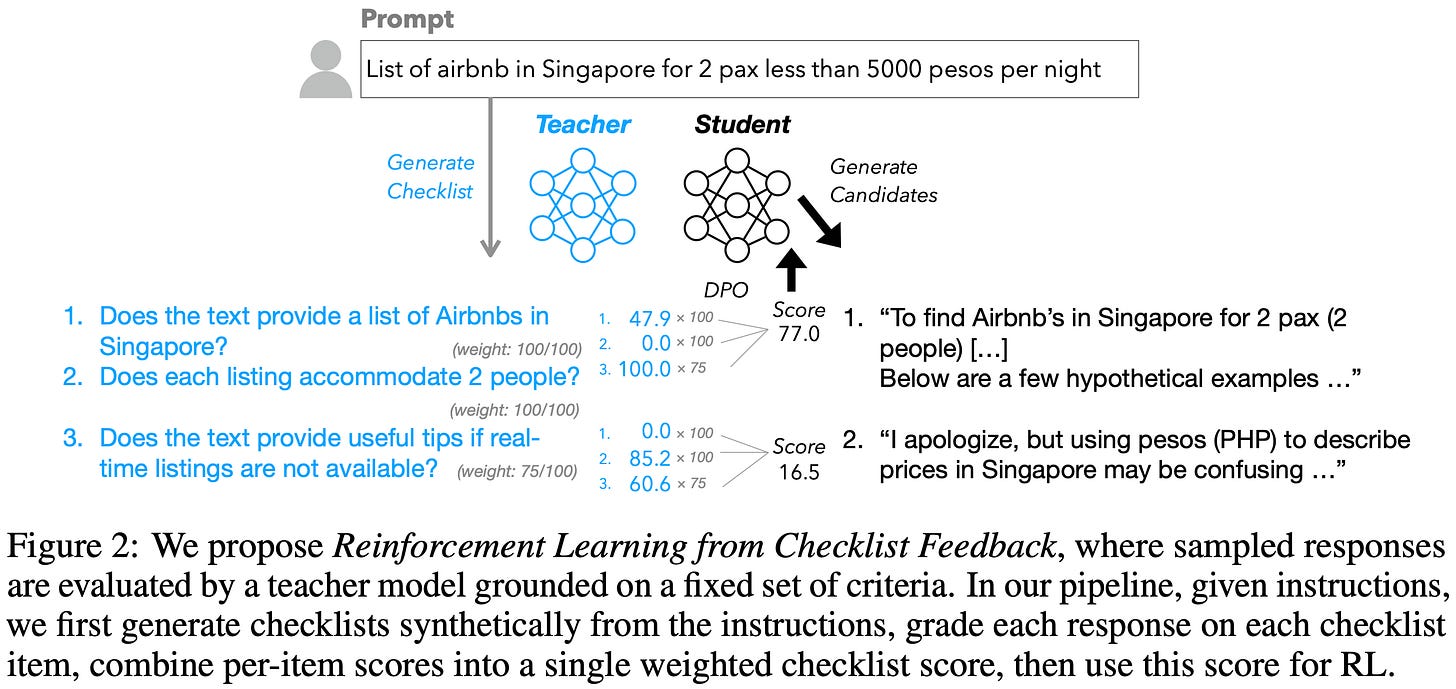 RL from Checklist Feedback (RLCF) [8] proposes a rubric-based approach for aligning language models to follow complex instructions. Instead of deriving rewards from a reward model trained on a static preference dataset, RLCF uses an LLM to generate instruction-specific checklists that outline the requirements of the instruction as a series of itemized steps. Each component of the checklist is an objective yes or no question that can be evaluated to derive a reward signal.