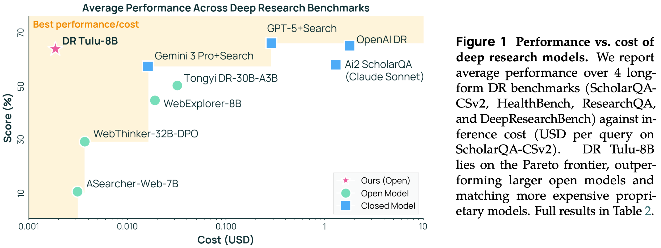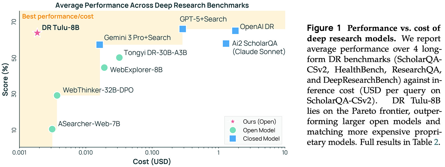 Performance and efficiency. Dr. Tulu-8B is evaluated on several DR benchmarks (ScholarQA, HealthBench, ResearchQA, and DeepResearchBench), where we see that it substantially outperforms other open DR agents—even those that are larger (e.g., Tongyi-DR-30B-A3B)—and frequently matches the performance of the top proprietary systems. Additionally, Dr. Tulu-8B is smaller and cheaper compared to other systems. Notably, Dr. Tulu-8B is up to three orders of magnitude cheaper than OpenAI DR in some cases; e.g., costs are reduced from $1.80 per query to $0.0019 per query on ScholarQA8. Much of these savings come from the ability to call the correct tools and avoid excessive tool usage that drastically increases API costs. Not only does Dr. Tulu-8B generally make fewer tool calls, but authors observe in [4] that the model heavily calls free paper search tools for academic benchmarks while only using paid web search tools for more general queries.