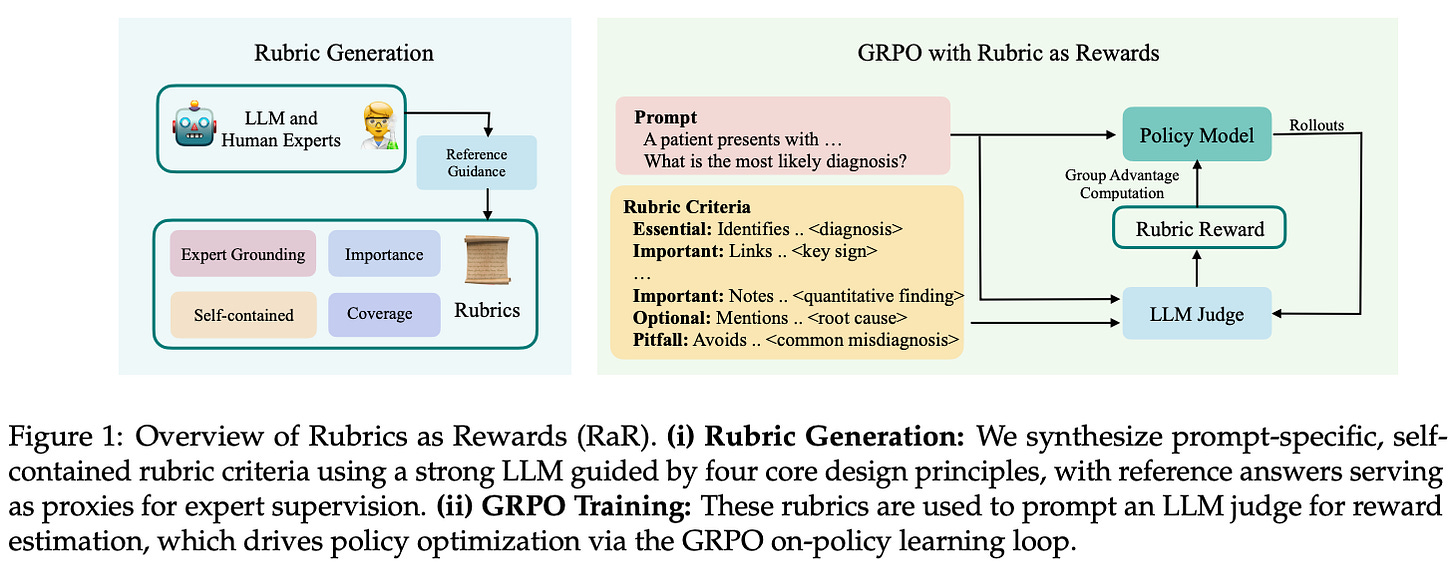 “Rather than using rubrics only for evaluation, we treat them as checklist-style supervision that produces reward signals for on-policy RL. Each rubric is composed of modular, interpretable subgoals that provide automated feedback aligned with expert intent. By decomposing what makes a good response into tangible, human-interpretable criteria, rubrics offer a middle ground between binary correctness signals and coarse preference rankings.” - from [1]