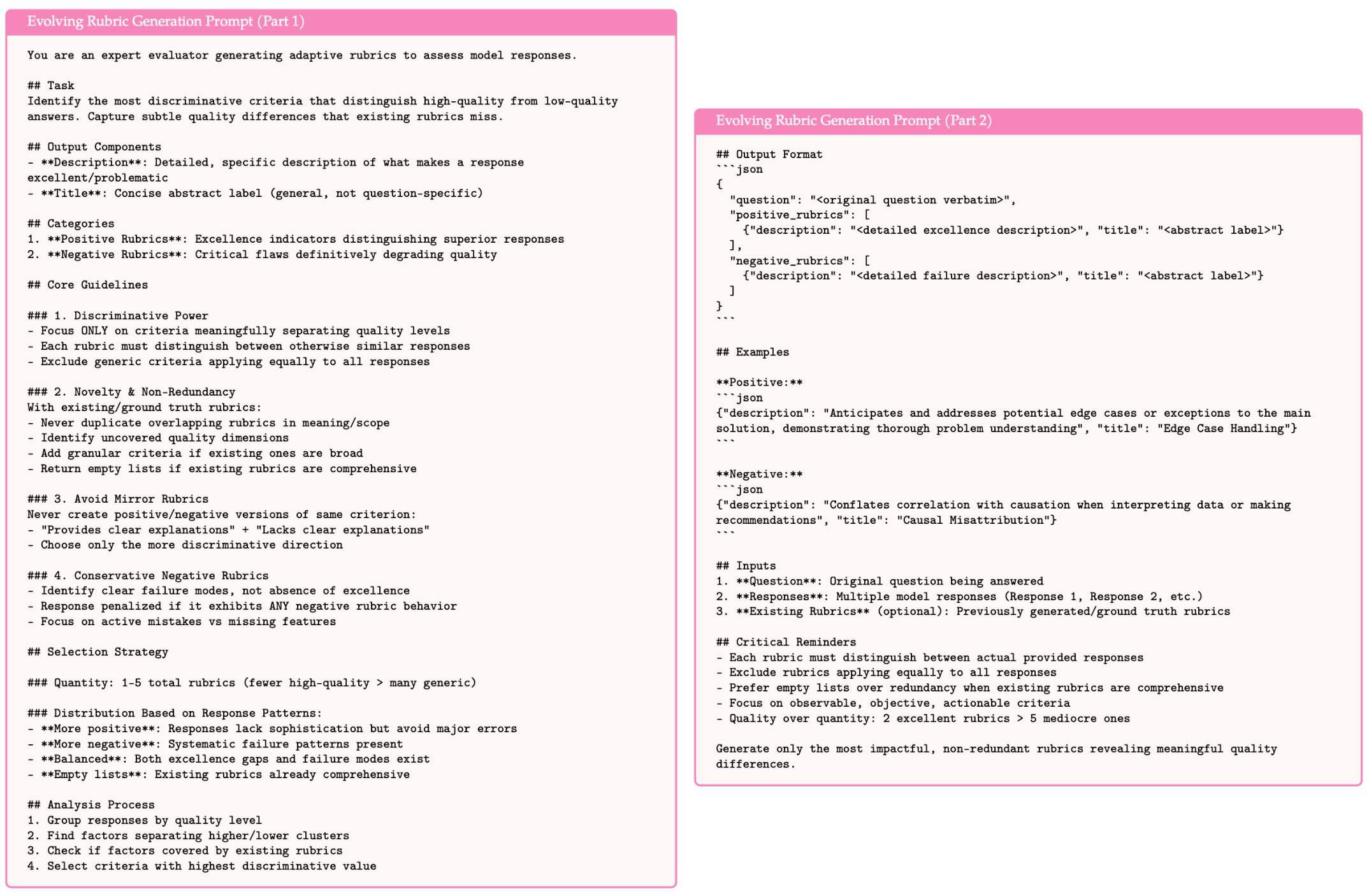 The rubric evolution process is found in [4] to have interesting characteristics, such as producing rubrics with measurably higher levels of specificity or even negative rubrics that penalize specific behaviors within the LLM; see above.