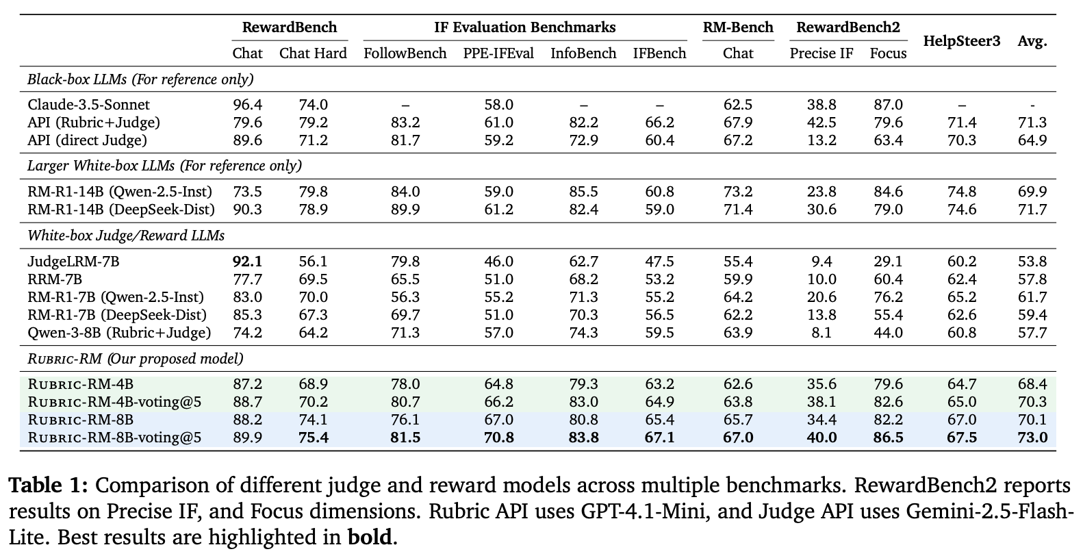 Comparison to other reward models. Rubric-RM is compared to a wide variety of other reward models and LLM-as-a-Judge approaches on several key evaluation benchmarks; see above. Rubric-RM tends to outperform similarly-sized baselines; e.g., the 8B variant gets 70.1% average accuracy, whereas the strongest 7B-scale reward model (RM-R1-7B) has an average accuracy of only 61.7%. These results are made even stronger with the use of majority voting. When comparing to the Qwen-3 base models, we see a noticeable uplift in preference scoring accuracy for Rubric-RM, highlighting the effectiveness of the finetuning strategy in [3].