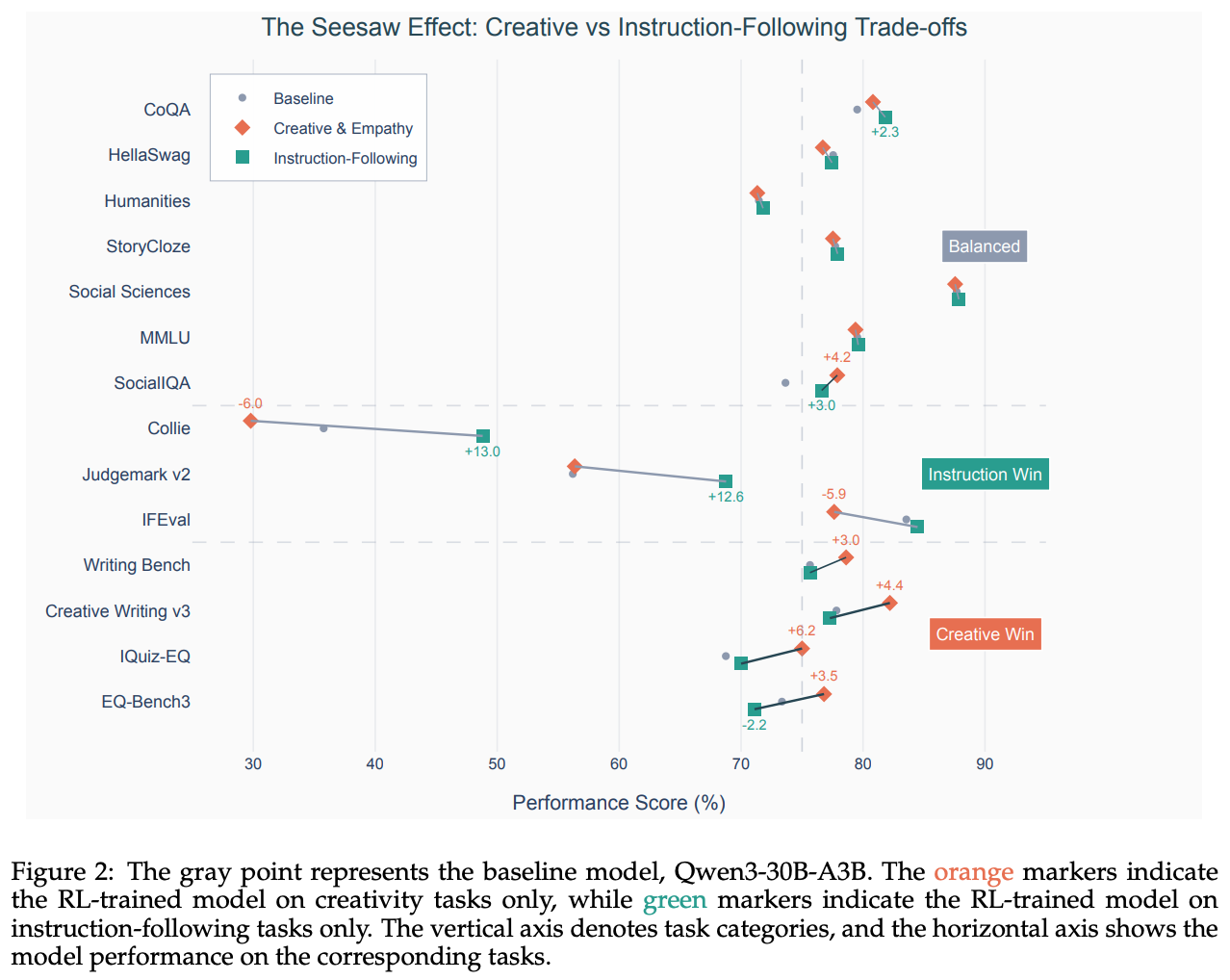 “Applying RL with rubrics from different task types could create conflicting objectives, leading to performance trade-offs — a phenomenon we refer to as the seesaw effect… training exclusively with instruction-following rubrics improves compliance but reduces creativity, while training exclusively with creativity and empathy rubrics enhances open-ended responses but harms strict adherence… These results suggest that simply combining all rubric types in a single RL run is likely to intensify such conflicts. To overcome this, we adopt a multi-stage RL strategy.” - from [2]