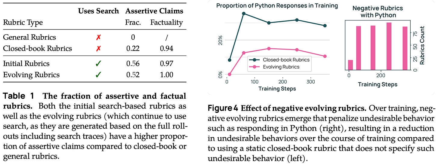 The evolving rubrics in [4] are grounded in external knowledge and allow the reward for RL to adapt to the current state of our policy. As the model discovers new behaviors (e.g., a reward hack), these changes can be identified and captured in a new or modified rubric to maintain training fidelity. For this reason, we do not need to create a rubric a priori that exhaustively captures all desiderata for evaluation, which is difficult for DR tasks. Rather, this system can observe policy behavior and automatically incorporate key trends into new rubrics.