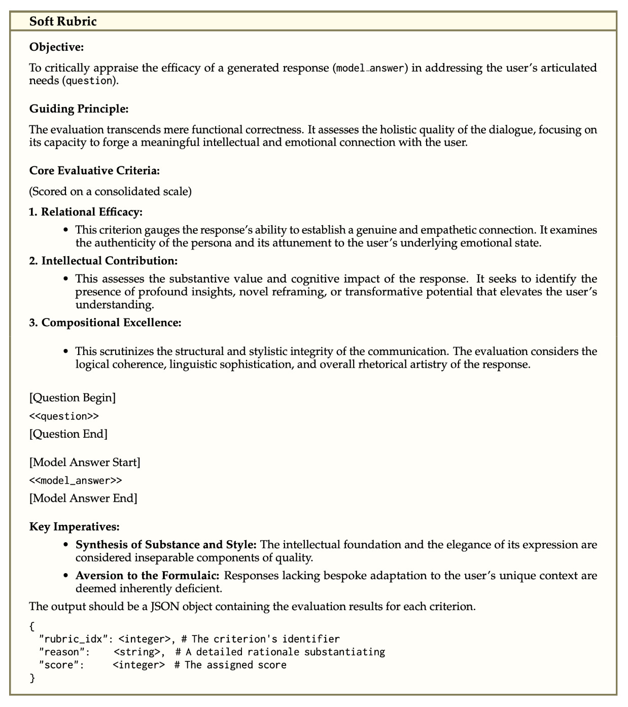To ensure rubric quality, authors run dedicated ablation experiments for every set of rubrics that is generated to measure their impact on the training process. Each rubric is comprised of K criteria C = {c_1, c_2, …, c_K}. An example of a rubric created for evaluating open-ended or creative tasks is provided below. After evaluating each of these criteria, we are left with a multi-dimensional reward vector that can be aggregated to yield a final reward.