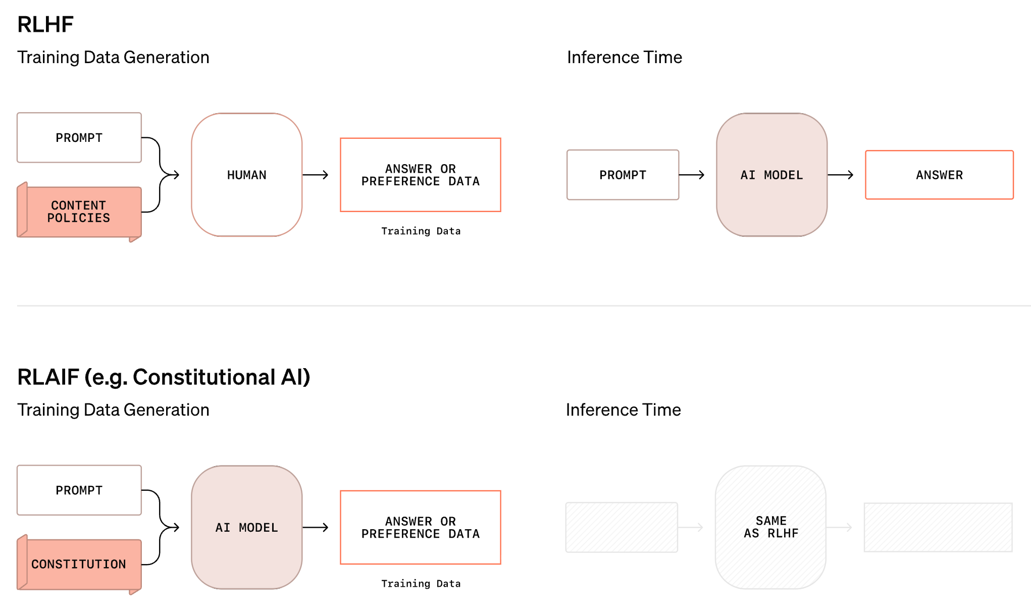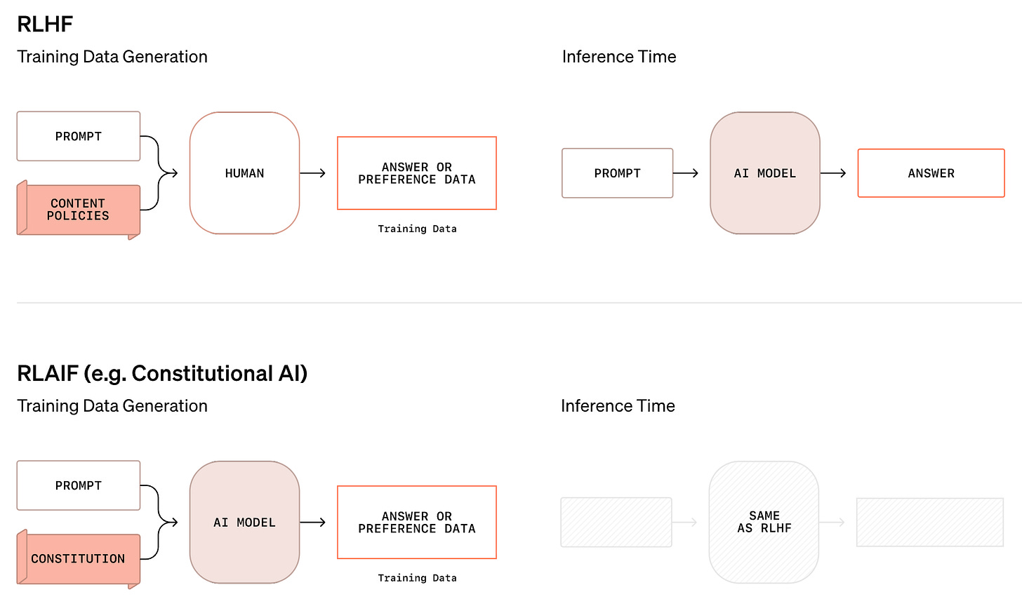 This approach avoids the need to re-collect data as criteria change. Rather, we just maintain a clear, itemized list of safety criteria—basically a safety rubric—that can be provided as input to the alignment system. Instead of collecting data, we focus on creating a “constitution” that dictates the behavior of our model. Once this constitution is available, we rely upon an LLM judge to apply the necessary supervision for achieving this desired behavior. This approach is both dynamic and interpretable, but it can only be applied in domains where the LLM judge is known to perform well. Extending similar techniques to arbitrary domains, which we will explore for the remainder of this post, is a non-trivial research problem.