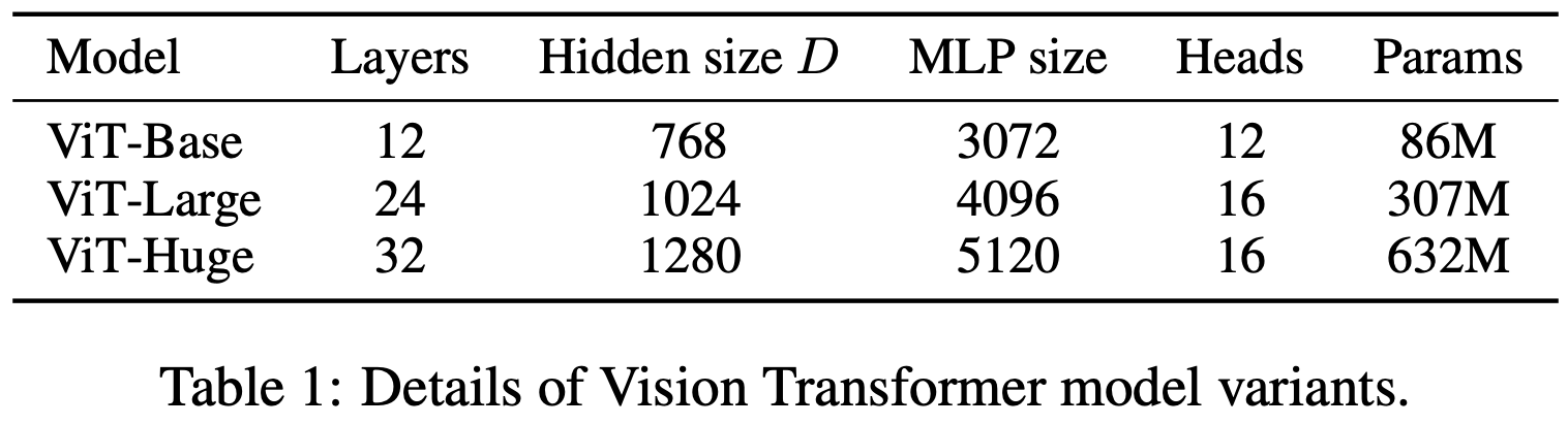 Training ViT. The original ViT model in [3] shares the same architecture as BERT. As shown above, multiple sizes of ViT are trained, the largest of which is ViT-H (or ViT-Huge)—we will see this model again later in the overview. All ViT models are trained using supervised image classification on datasets of varying sizes. When ViTs are trained over small or mid-sized datasets (e.g., ImageNet), they perform comparably to—or slightly worse than—ResNets3 of comparable size. However, ViTs begin to shine when pretrained over much larger datasets (e.g., JFT-300M) and finetuned afterwards on downstream tasks; see below.